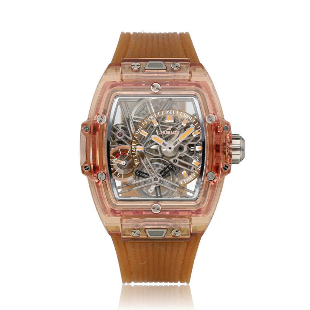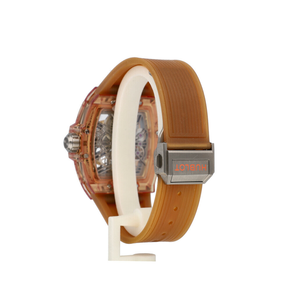 In very good condition Hublot Spirit of Big Bang in orange Sapphire with skeleton dial and orange rubber strap from 2023 complete with box and papers