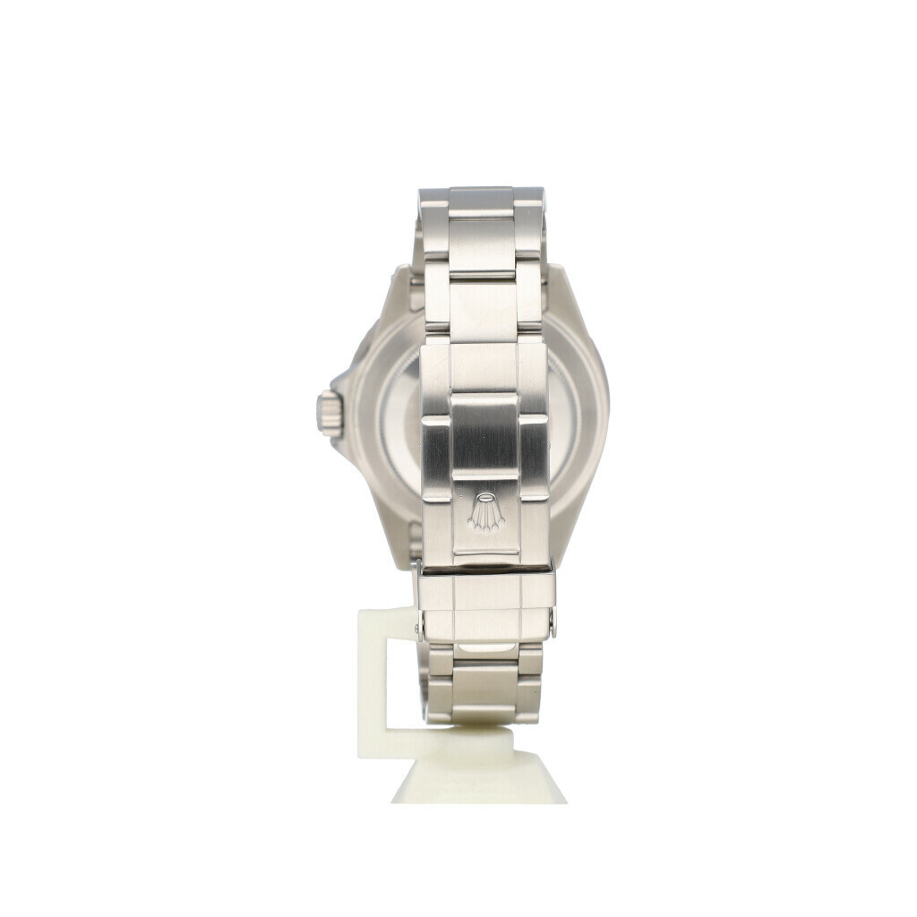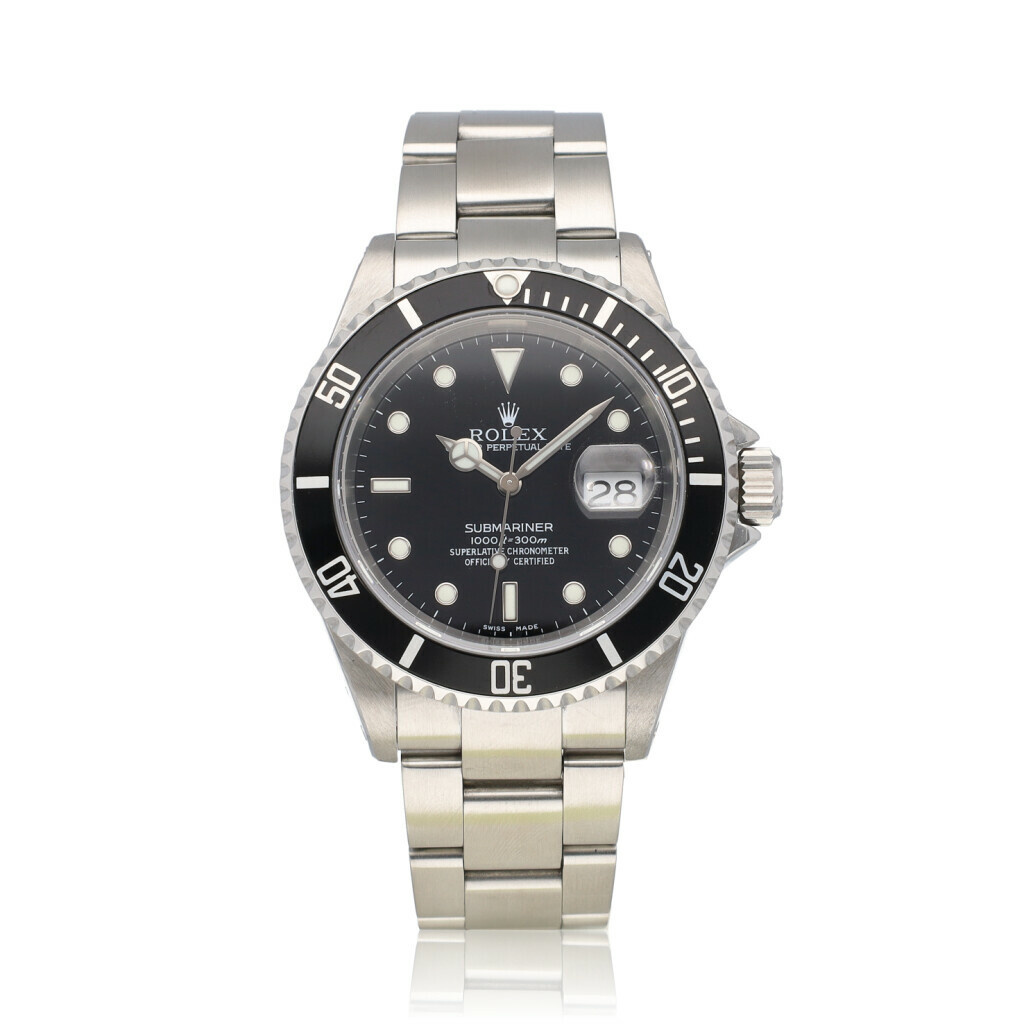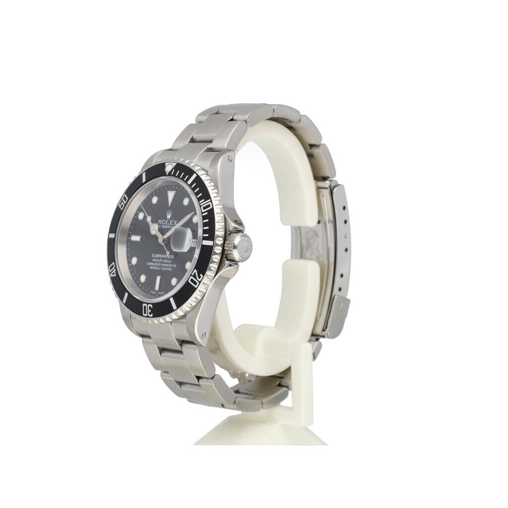 In very good condition Rolex Submariner in steel with black dial, black aluminum bezel and steel Oyster bracelet from 2002 complete with box and papers.