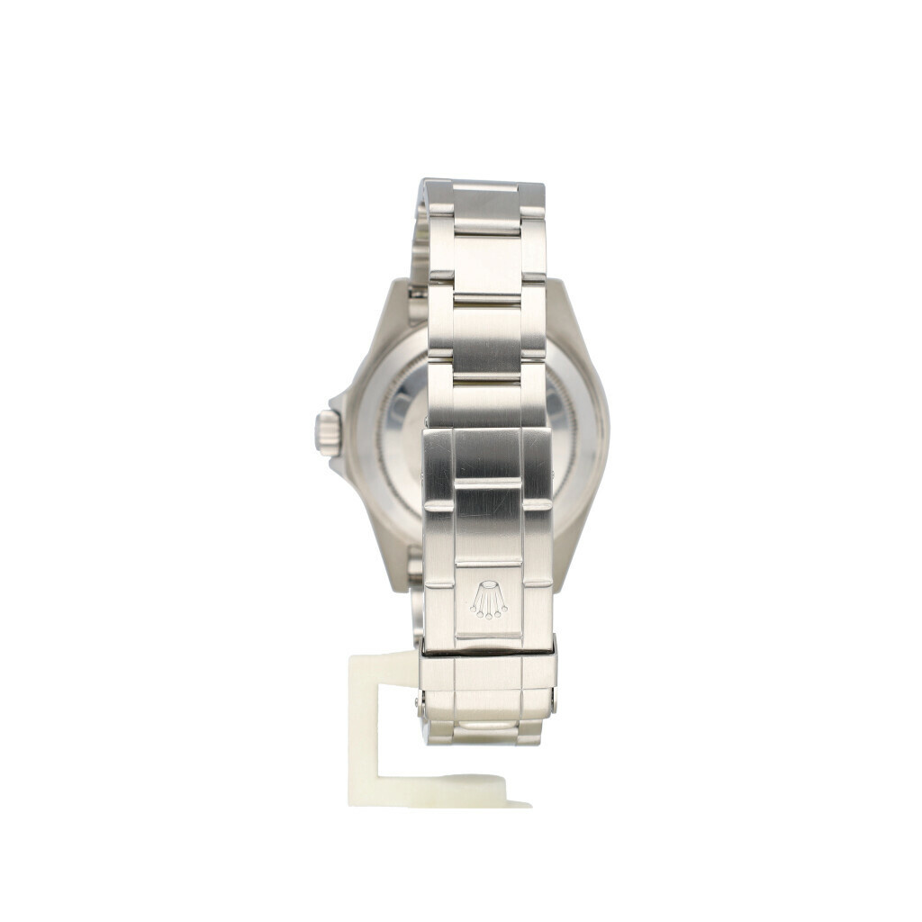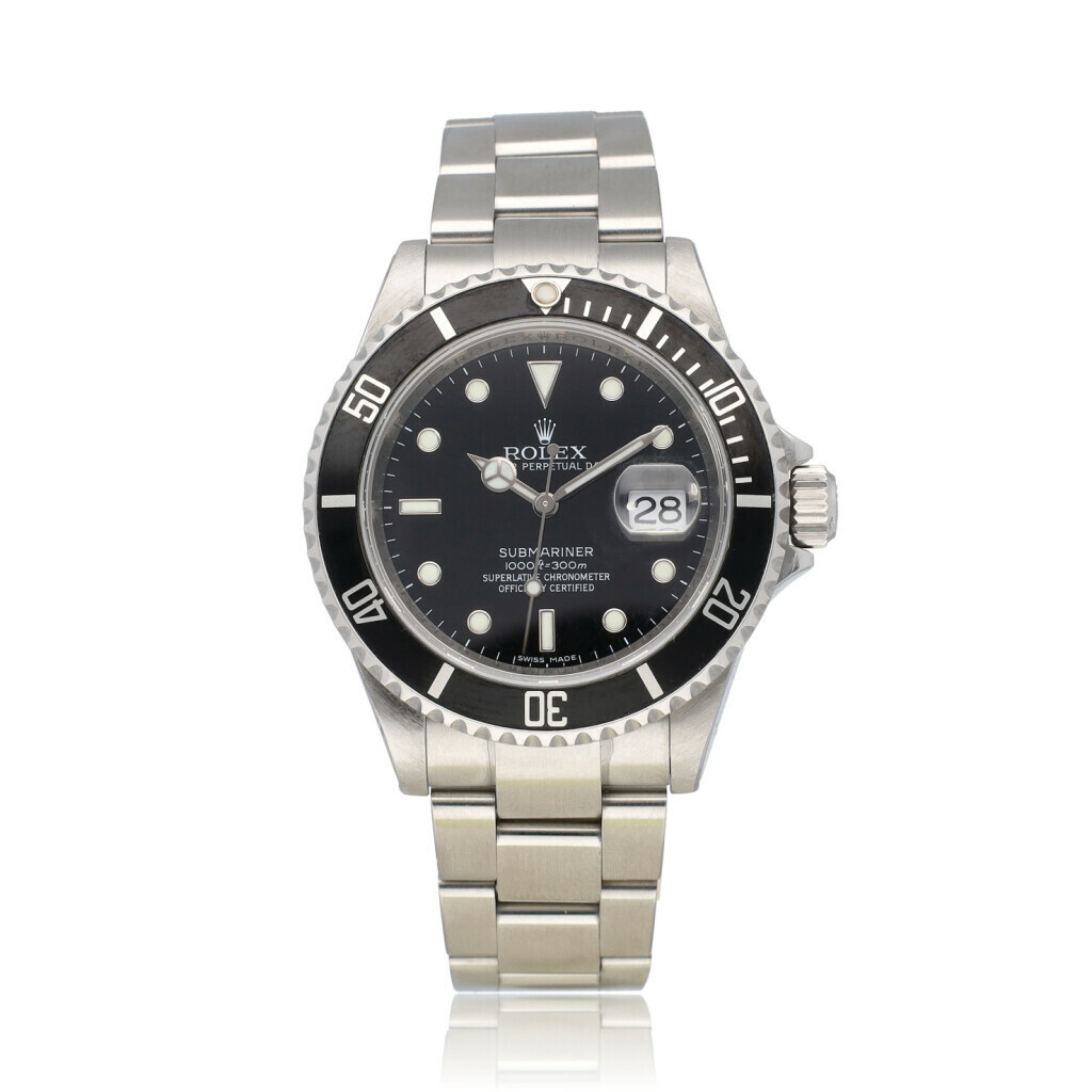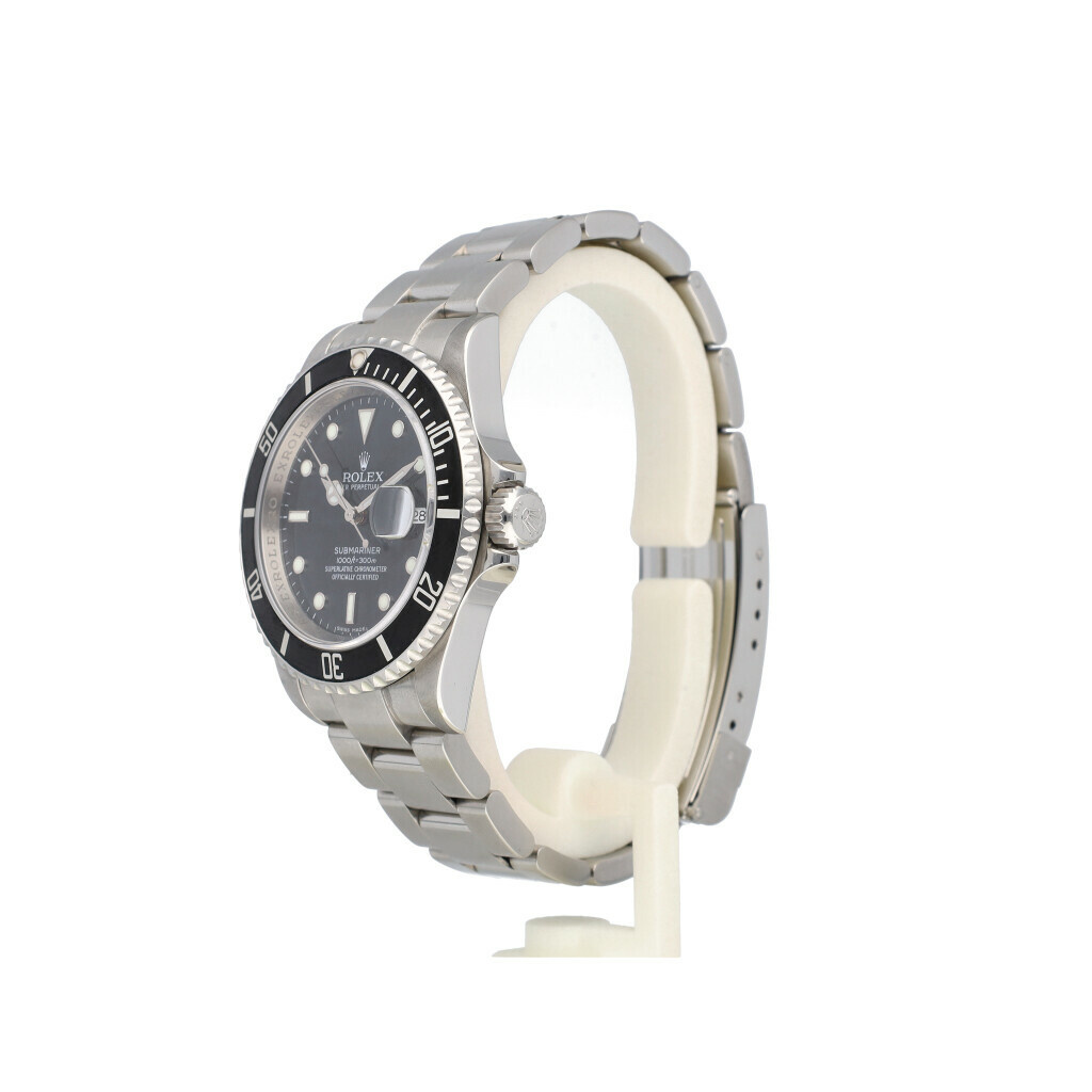 In very good condition Rolex Submariner in steel with black dial, black aluminum bezel and steel Oyster bracelet from 2008 complete with box and papers