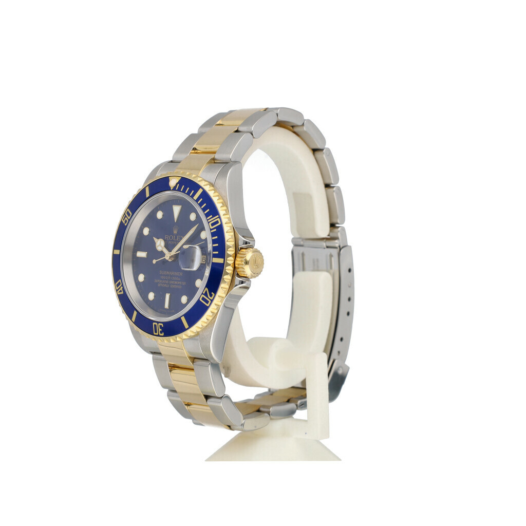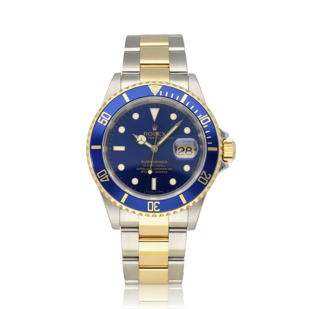 In very good condition Rolex Submariner Date in steel and yellow gold with yellow gold bezel, blue sunburst dial and steel and yellow gold Oyster bracelet from 2006 complete with papers, no box.