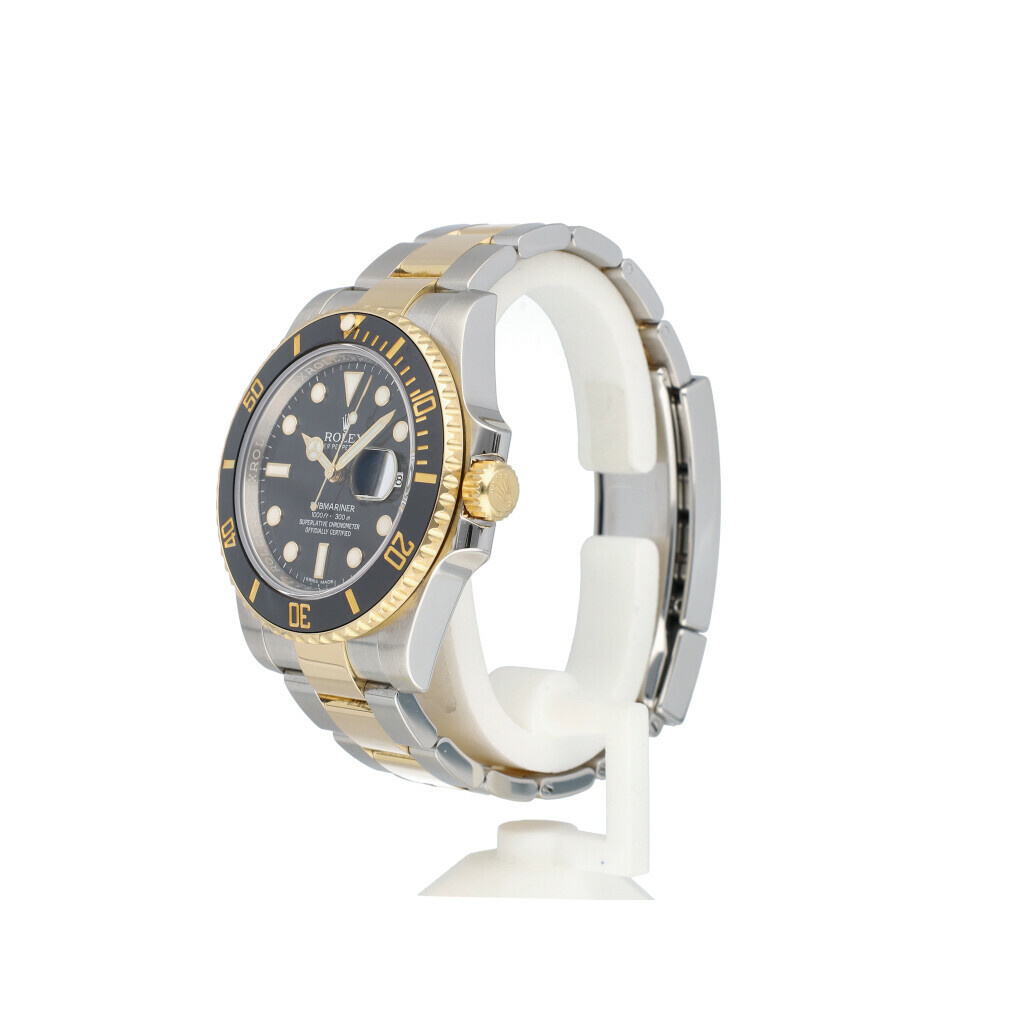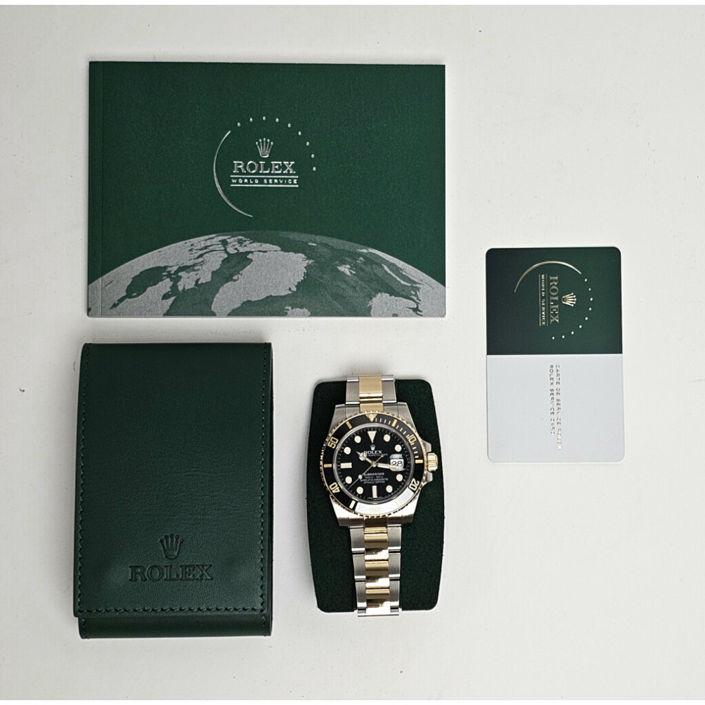In very good condition Rolex Submariner in steel and yellow gold with black dial. Random serial number so from after 2011. No box and/or papers. Rolex serviced 12-2024 and not worn since. Rolex service certificate included.