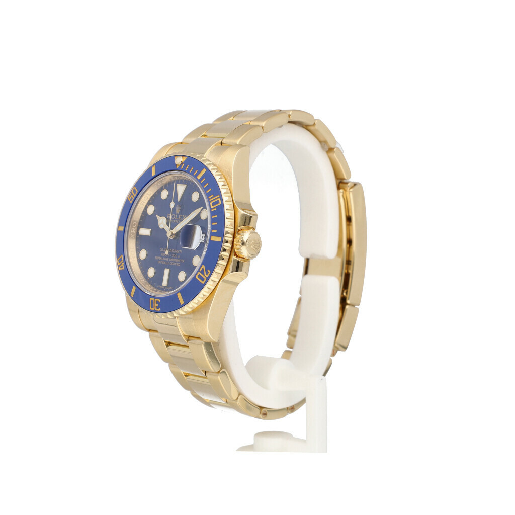 In very good condition Rolex Submariner Date in yellow gold so called 'bluesy' with blue dial, ceramic blue bezel and yellow gold Oyster bracelet from 2015 complete with box and papers. Rolex serviced 4-2025 and not worn since. Rolex service certificate included.