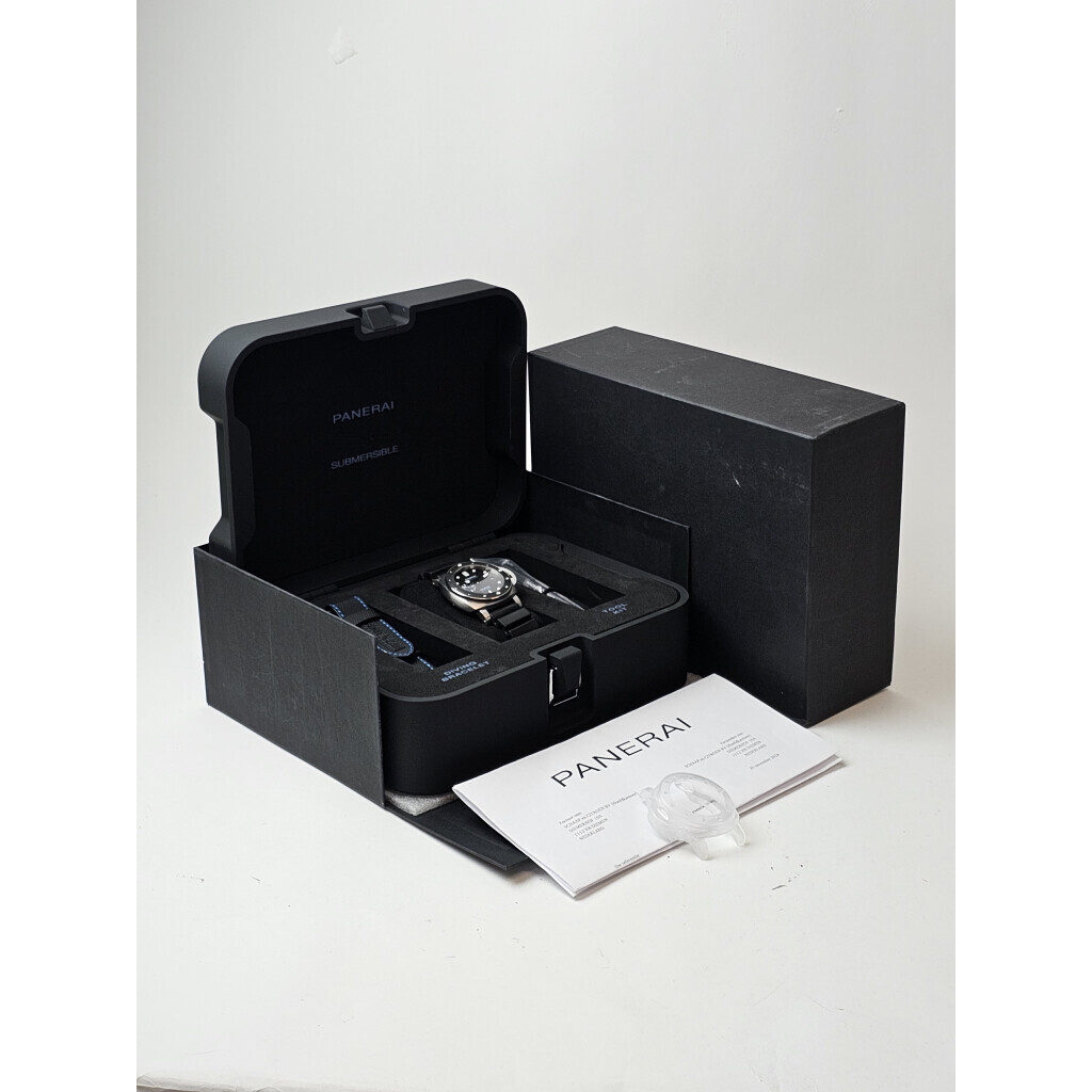 In very good condition Panerai Submersible in steel with black dial complete with box and papers. Panerai serviced 11-2024 and not worn since. Panerai service papers included.