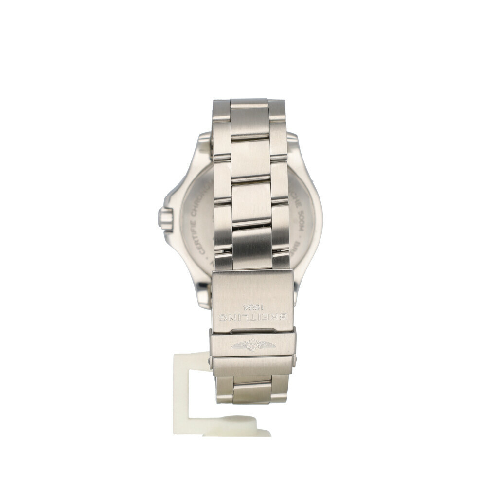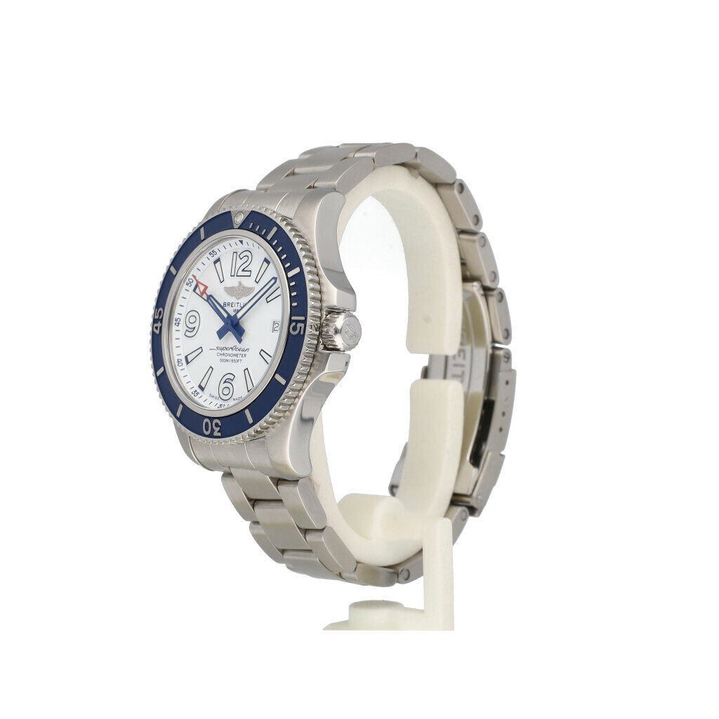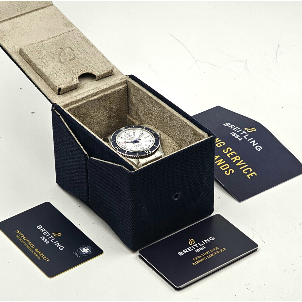 In very good condition Breitling Superocean II automatic in steel with white dial, blue ceramic bezel and steel bracelet from 2023 complete with box and papers. Breitling serviced 8-2025 and not worn since. Breitling service certificate included.
