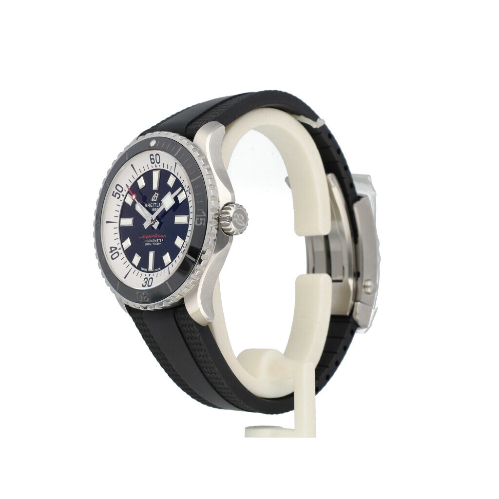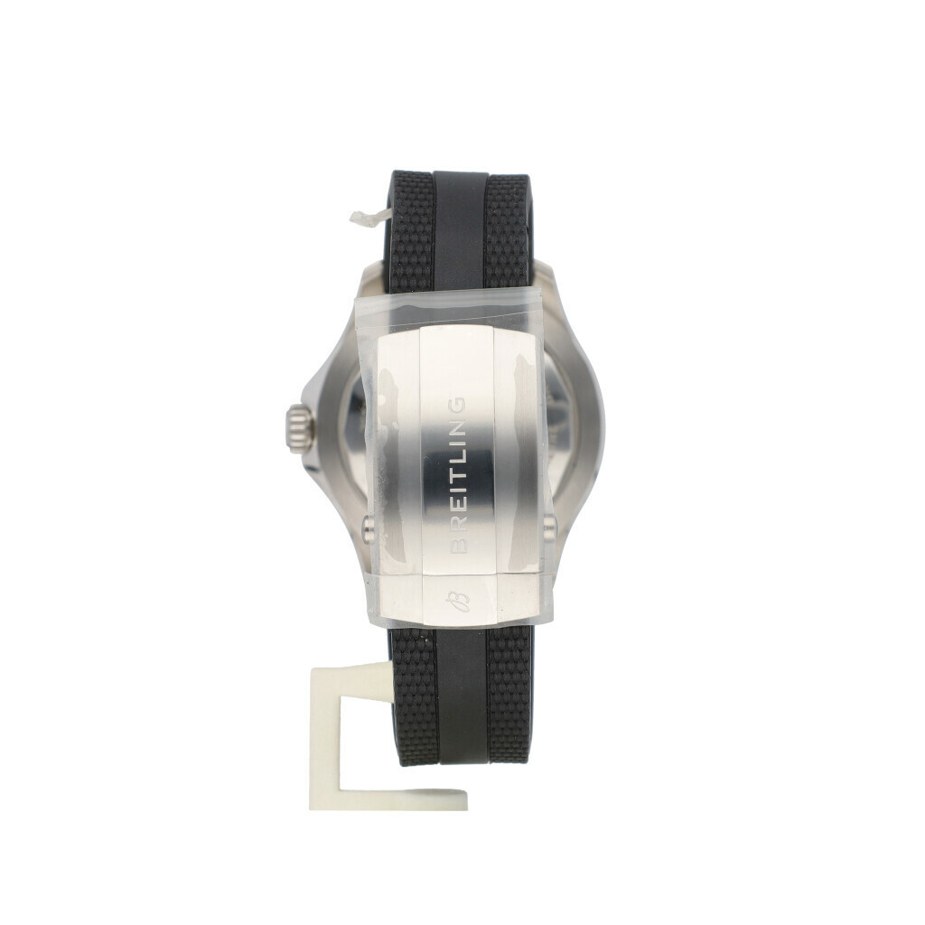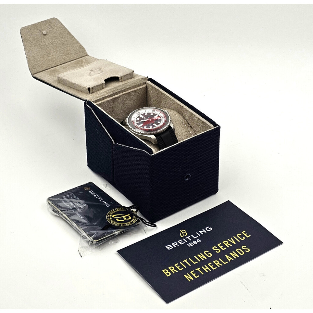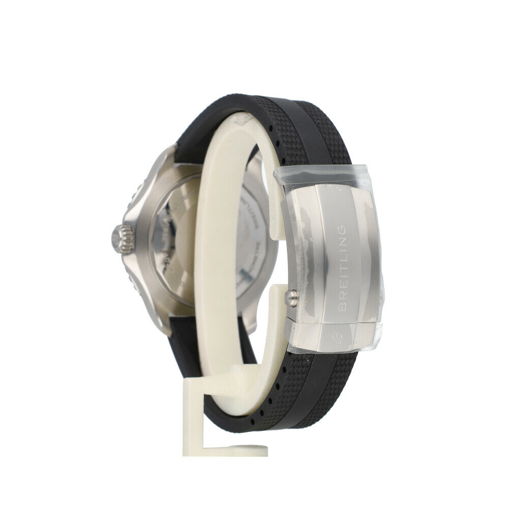 In very good condition Breitling Superocean Automatic in steel with black dial and black rubber strap from 2023 complete with box and papers. Breitling serviced 1-2026 and not worn since. Breitling service papers included.