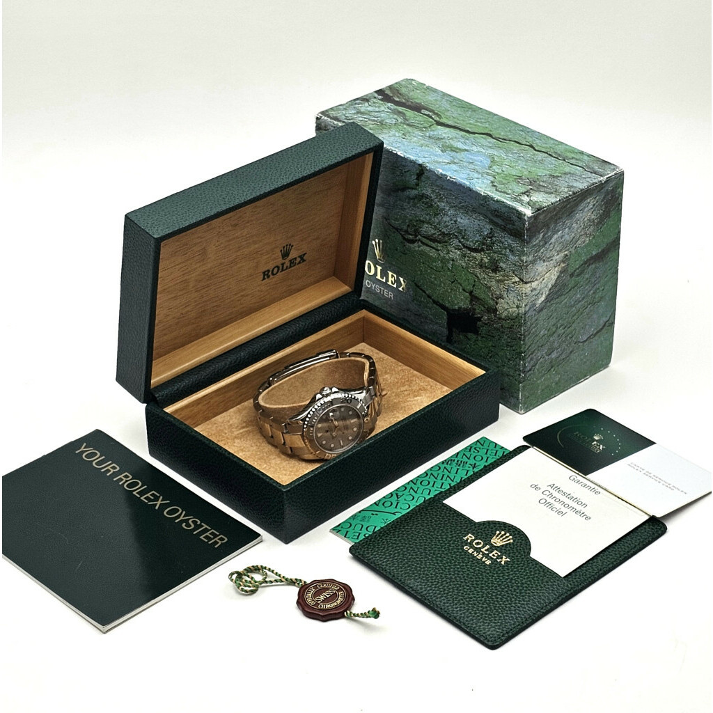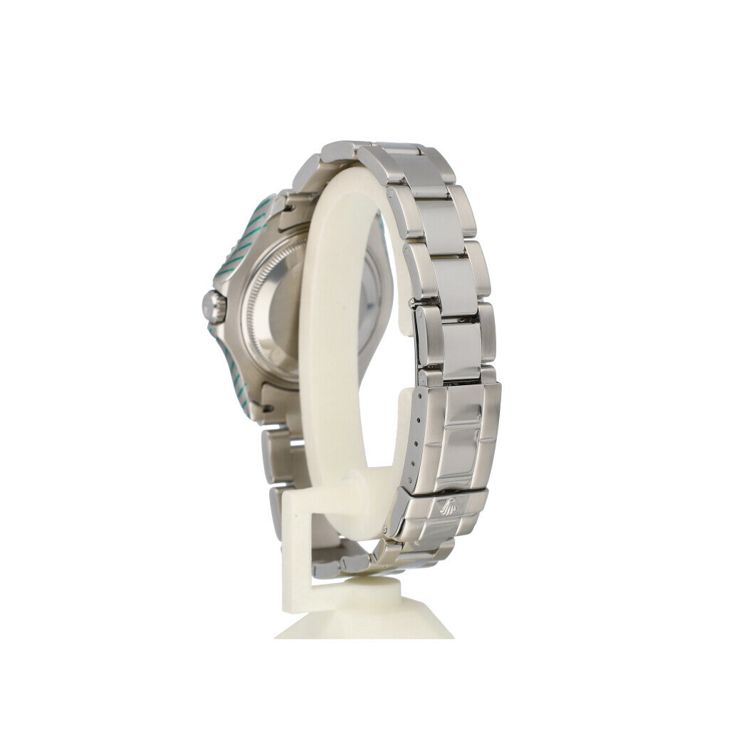 In very good condition Rolex Yacht-Master in steel and platinum with platinum coloured dial, platinum bezel and steel Oyster bracelet from 2004 complete with box and papers. Rolex serviced 1-2026 and not worn since. Rolex service certificate included.