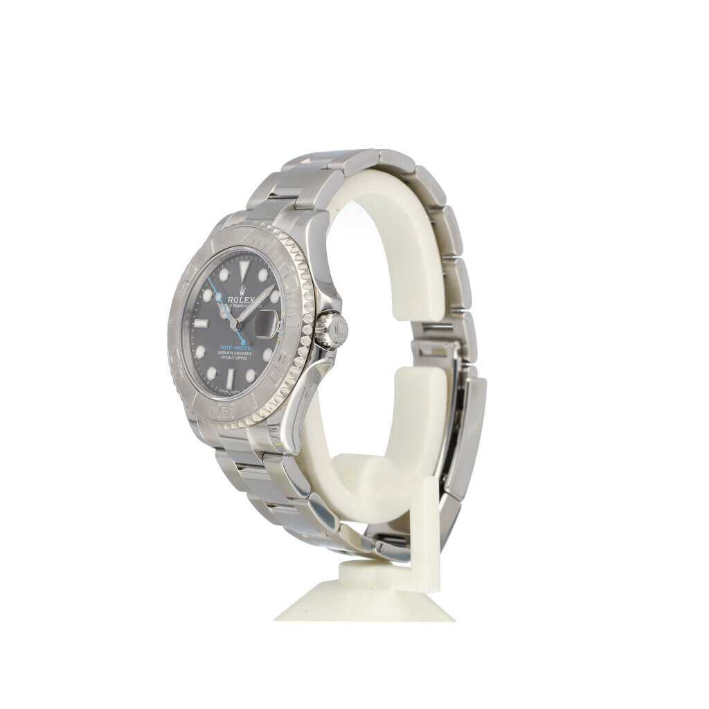 In very good condition Rolex Yacht-Master medium in steel and platinum with slate coloured dial, platinum bezel and steel Oyster bracelet from 2017 complete with box and papers. Rolex serviced 10-2025 and not worn since. Rolex service certificat included.