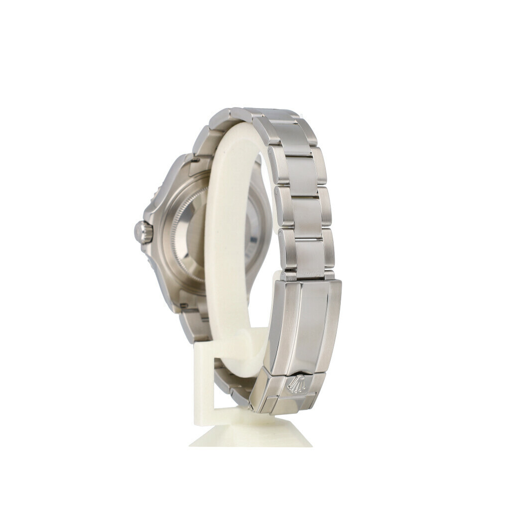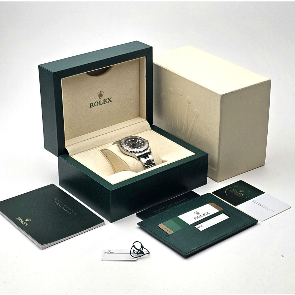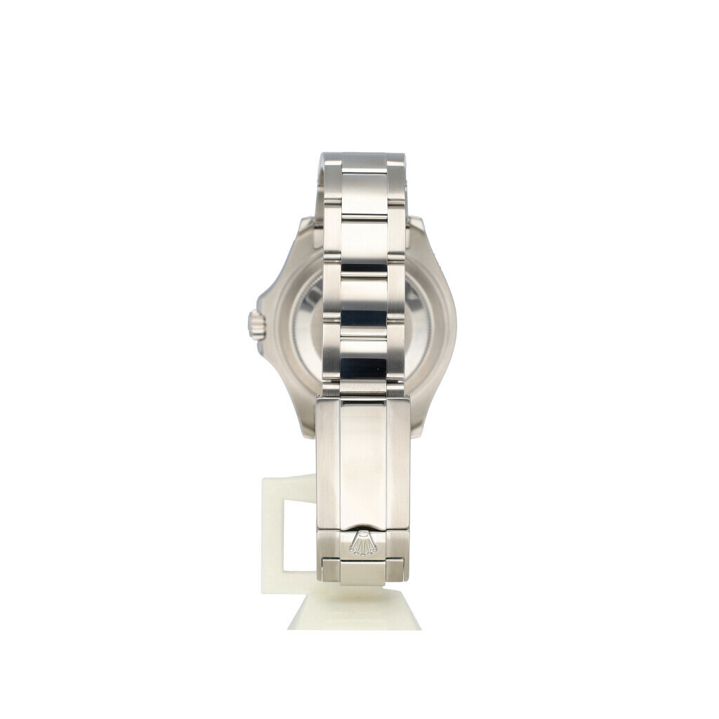 In very good condition Rolex Yacht-Master medium in steel and platinum with slate coloured dial, platinum bezel and steel Oyster bracelet from 2017 complete with box and papers. Rolex serviced 10-2025 and not worn since. Rolex service certificat included.