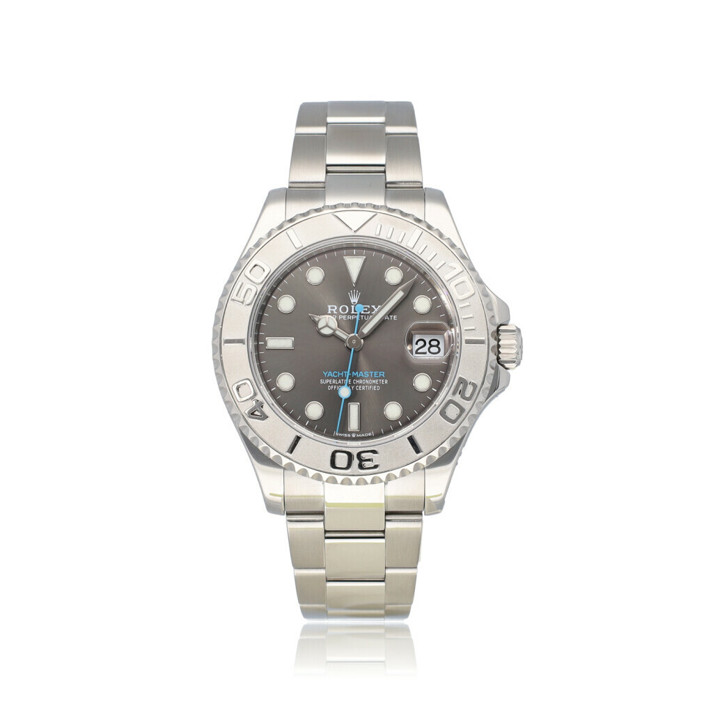 In very good condition Rolex Yacht-Master medium in steel and platinum, with platinum bezel, grey / slate dial and steel Oyster bracelet from 2019 complete with box and papers.