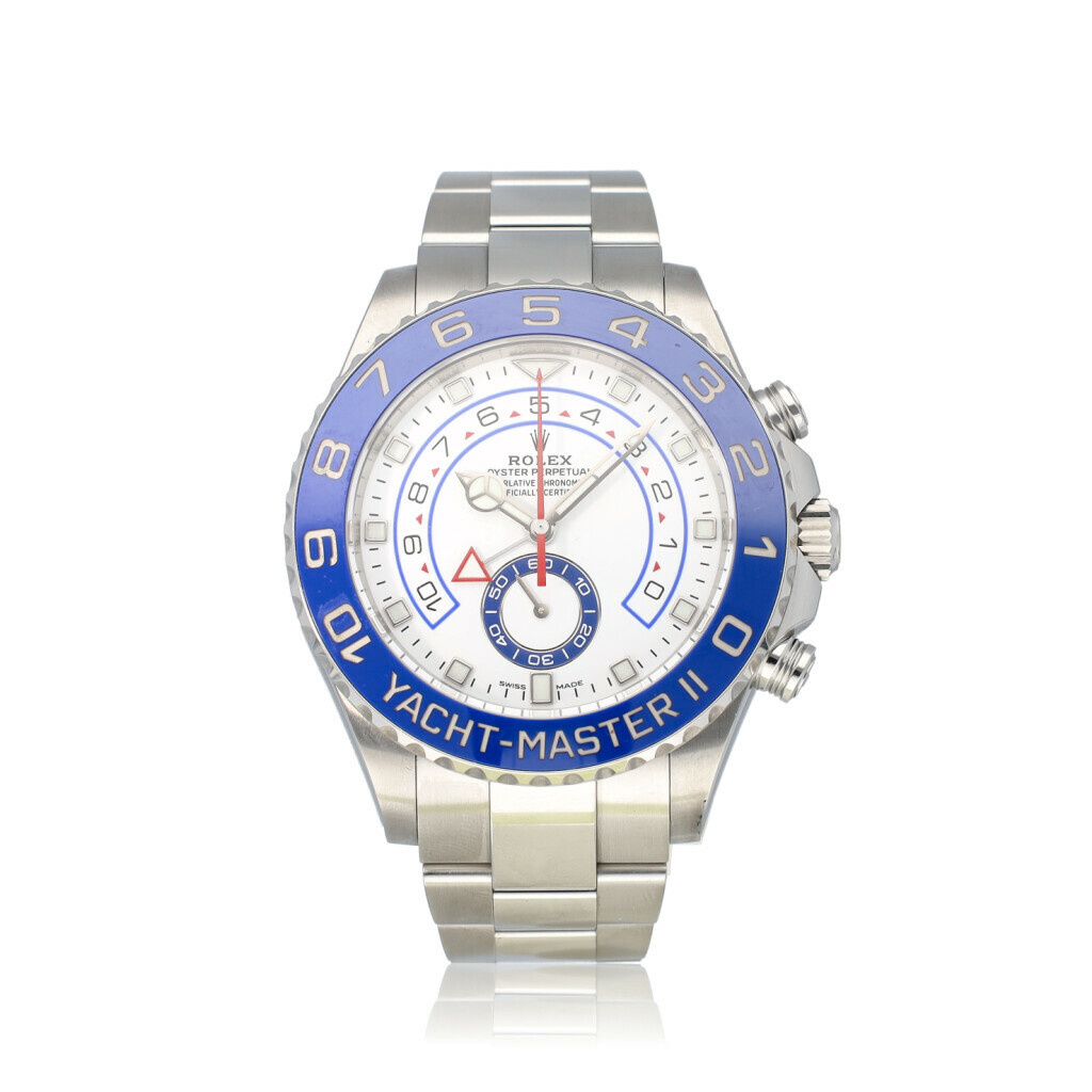 In very good condition Rolex Yacht-Master II in steel with white dial, blue blue ceramic bezel and steel Oyster bracelet from 2020 complete with box and papers.